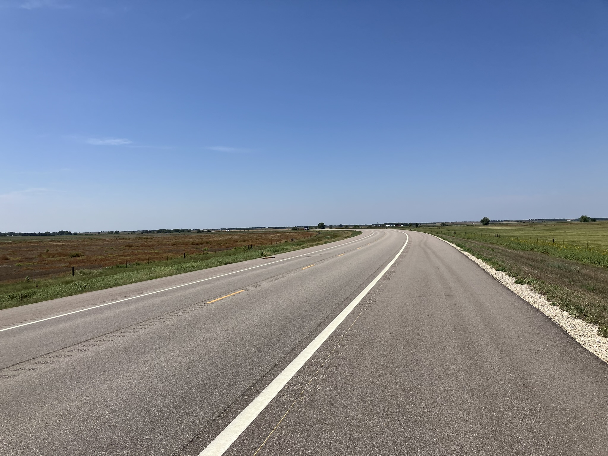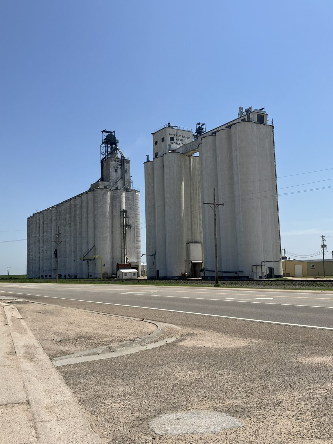 The driving has ben fine, even for these long, many hours drives (today I covered about 340 miles, maybe 6 hours of driving in all) , through Kansas, and Kansas is definitely flat (have I said before?), marked with grain silos and elevators in every town, running along the railroad. In fact, grain elevators ought to be the state symbol. I also saw lots of wind turbines along the way, but they came and went, unlike the grain elevators, which are a constant feature. It’s flat out there.