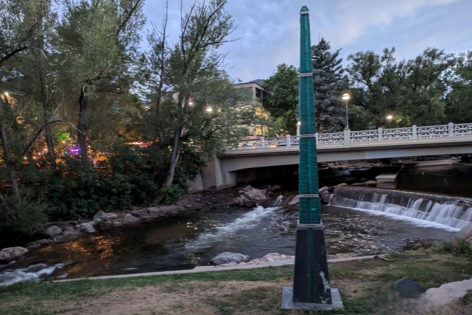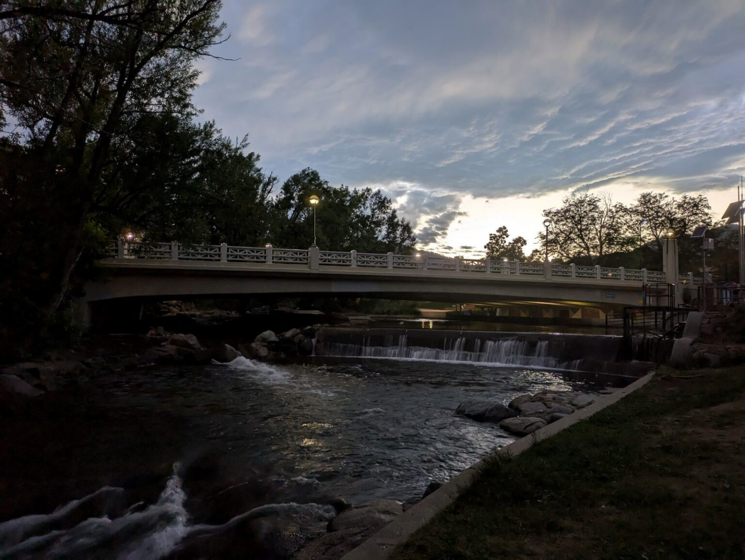 We headed back to the hotel for a while, to rest up a bit, and then headed back into beautiful downtown Boulder for dinner, and a little more of a walk and drive around, and wound up our day by releasing some more of Bev’s ashes in the lovely (like all of Boulder, seemingly) Boulder Creek Park, at a lovely time of day as dusk was coming down over Boulder, and some nice music playing at a local venue in the background. A lovely day.