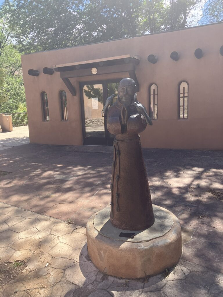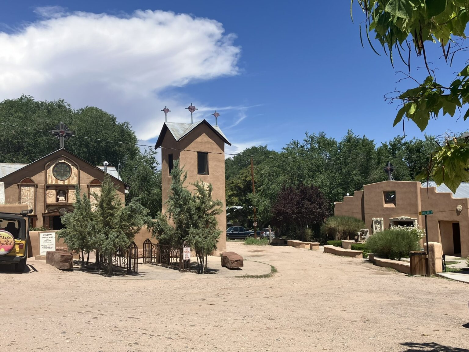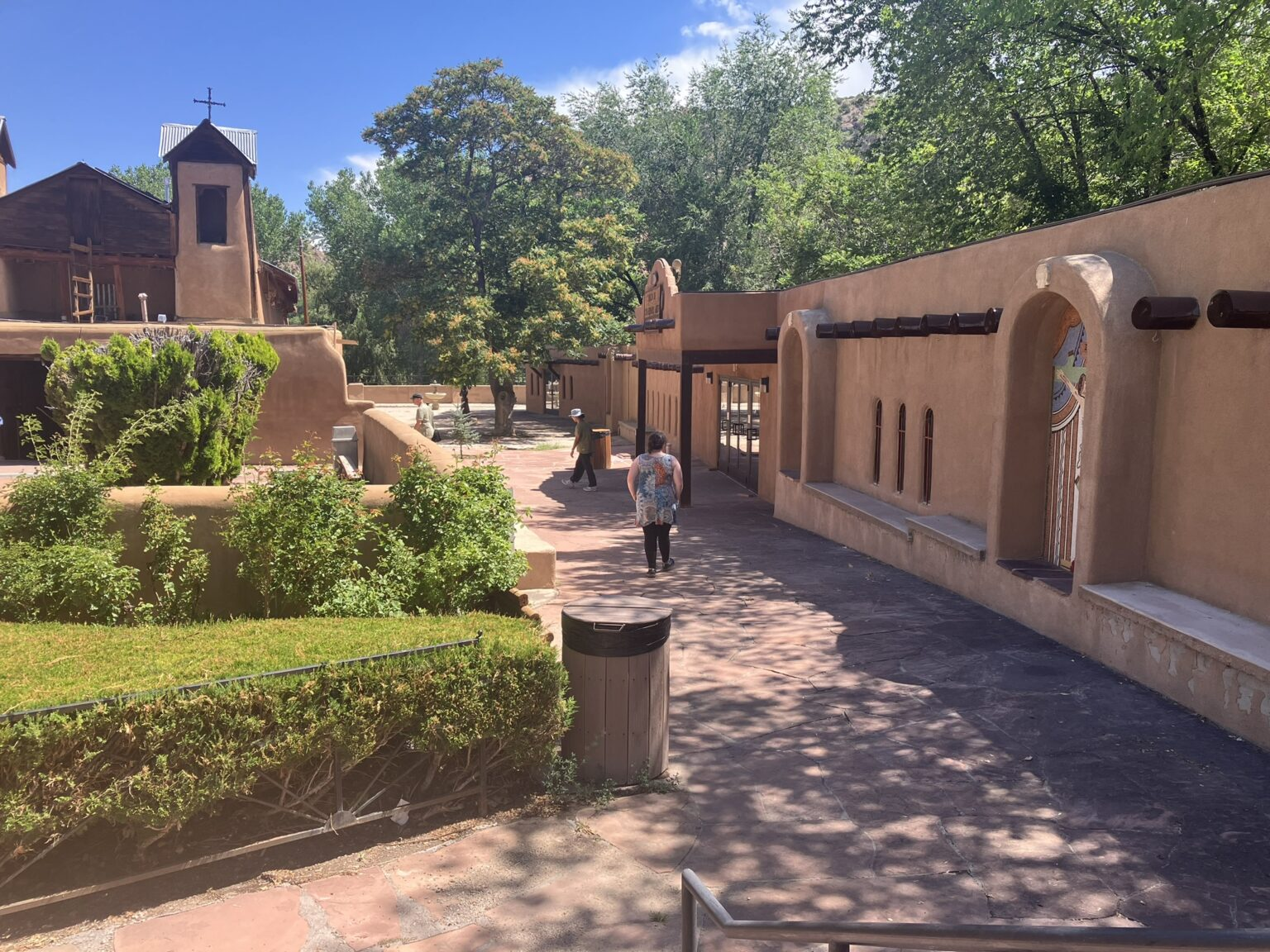 On our way from Taos to Santa Fe, we took the back way down, stopping to visit the Santuario de Chimayo church en route. The main road to Santa Fe is itself beautiful, but this route, known as the High Road because of its higher elevation, is even nicer, taking local back roads that pass through local towns and villages, and the church, nestled in the Sangre de Cristo Mountains, is a wonderful place to visit. Bev, Marguerite, and I stopped there when we were last here, in 2021.