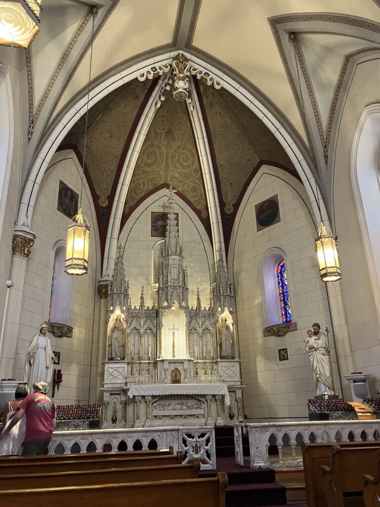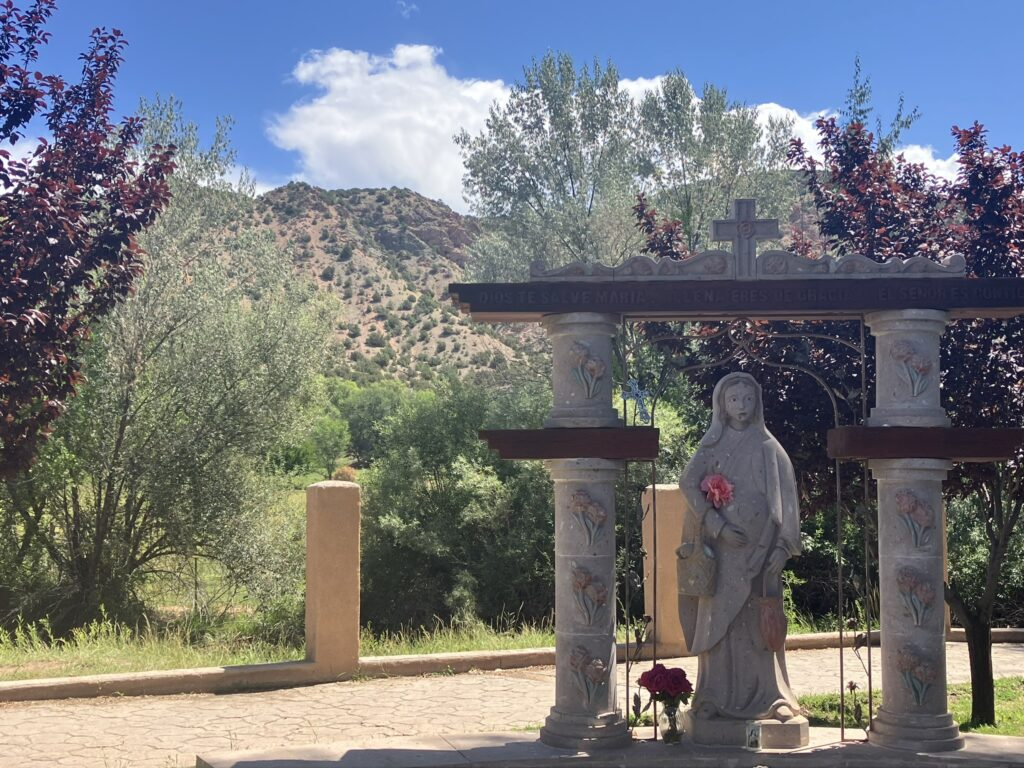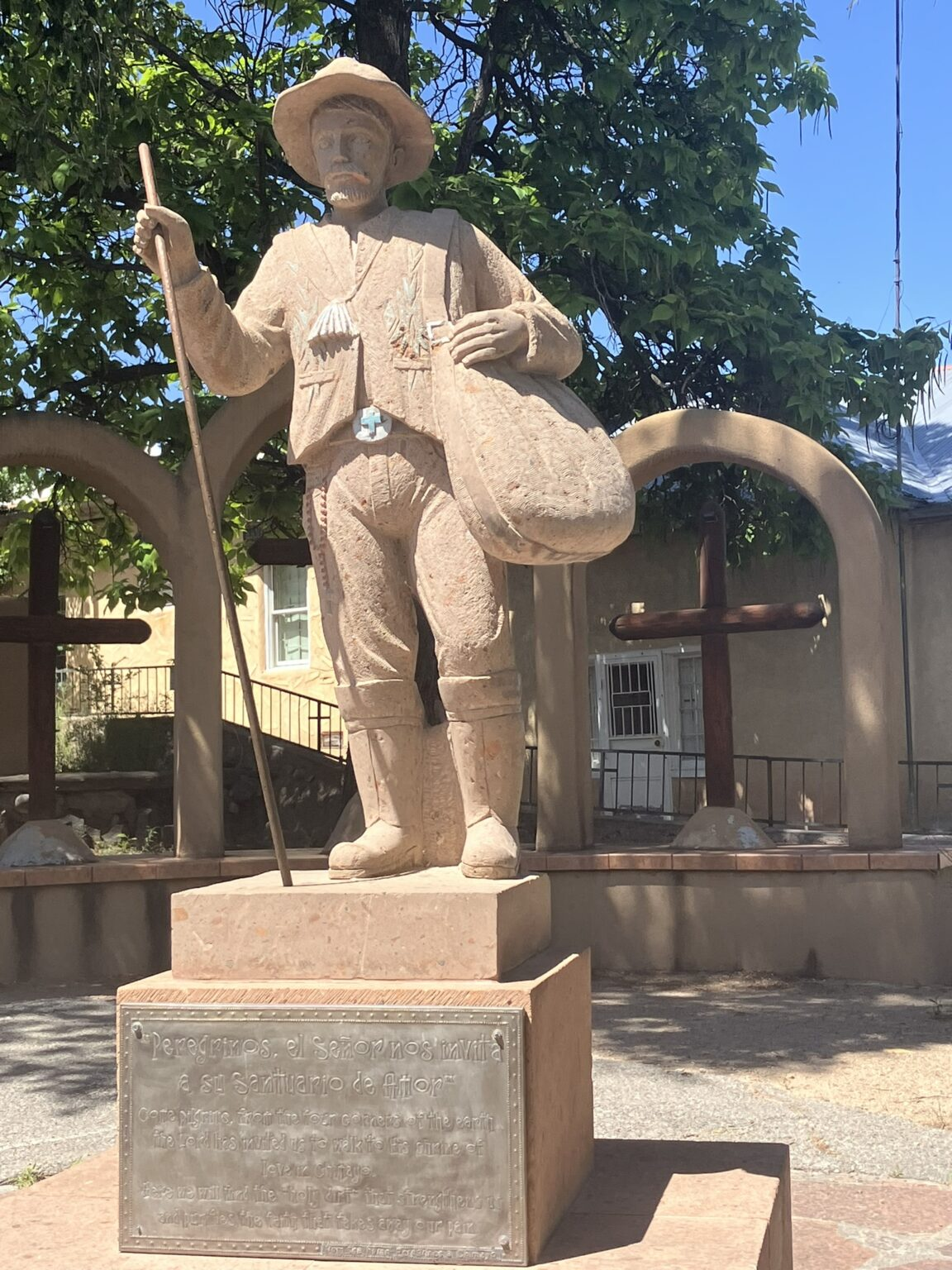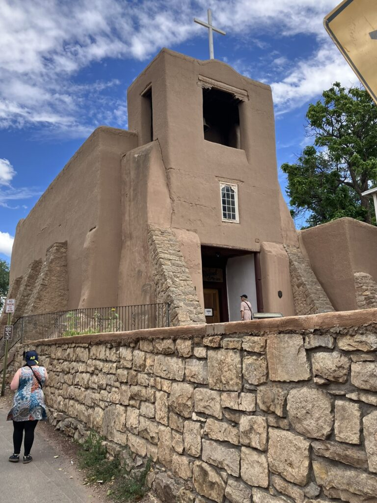 On our way from Taos to Santa Fe, we took the back way down, stopping to visit the Santuario de Chimayo church en route. The main road to Santa Fe is itself beautiful, but this route, known as the High Road because of its higher elevation, is even nicer, taking local back roads that pass through local towns and villages, and the church, nestled in the Sangre de Cristo Mountains, is a wonderful place to visit. Bev, Marguerite, and I stopped there when we were last here, in 2021.