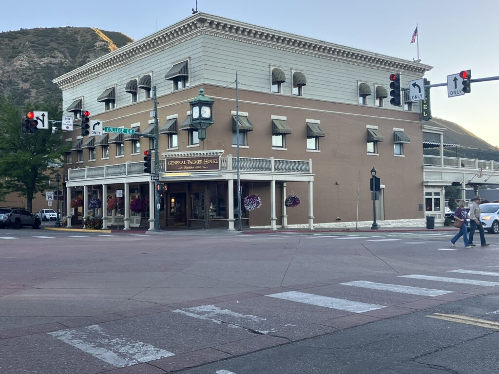 We arrived in Durango, a small city of a little over 19,000 people, with an average age of 36 or 37, mid-afternoon, and checked into our very nice hotel, where we’ll be staying for 2 nights, the Adobe Inn. What a really nice city… really nice. As Kaye said, in both New Mexico and here in Durango, and these parts of Colorado we’ve visited, nature and life seems intertwined. Clean and well maintained, nice cityscapes, surrounded by and embedded in gorgeous and often magnificent environments. Durango is one of those places. We loved it immediately.