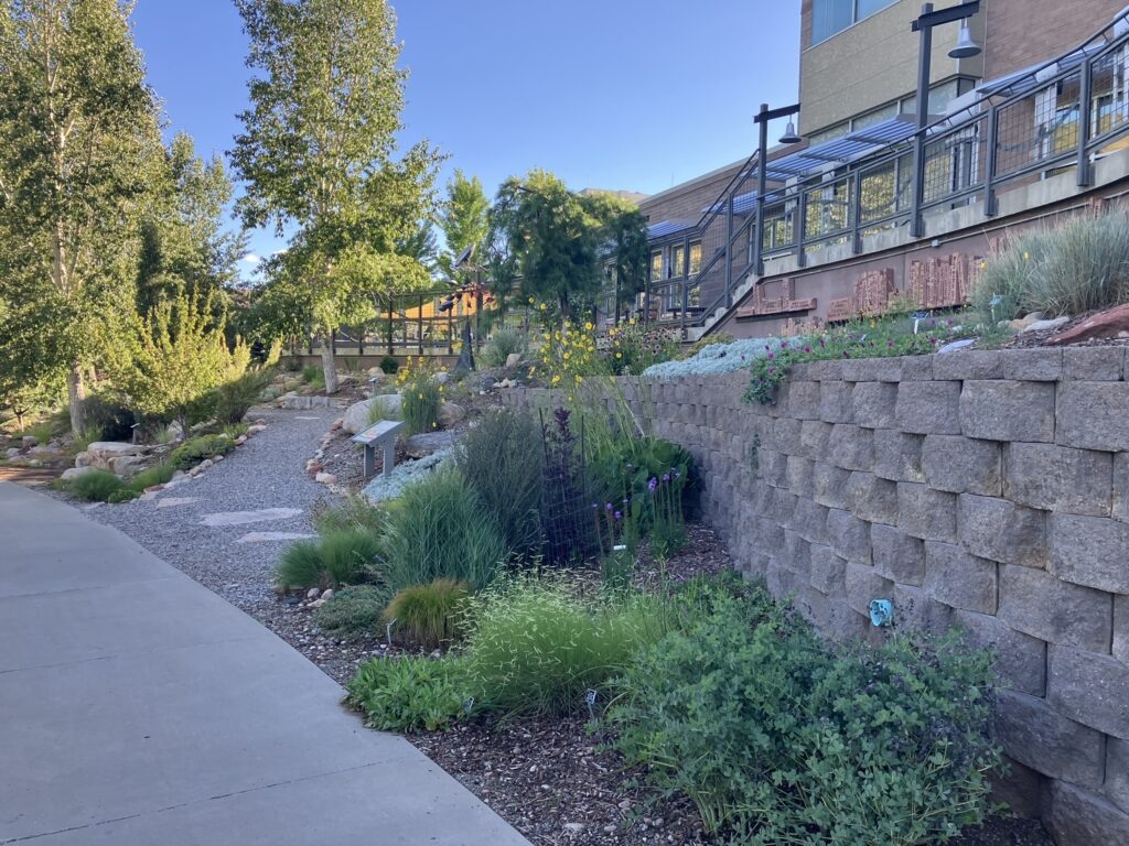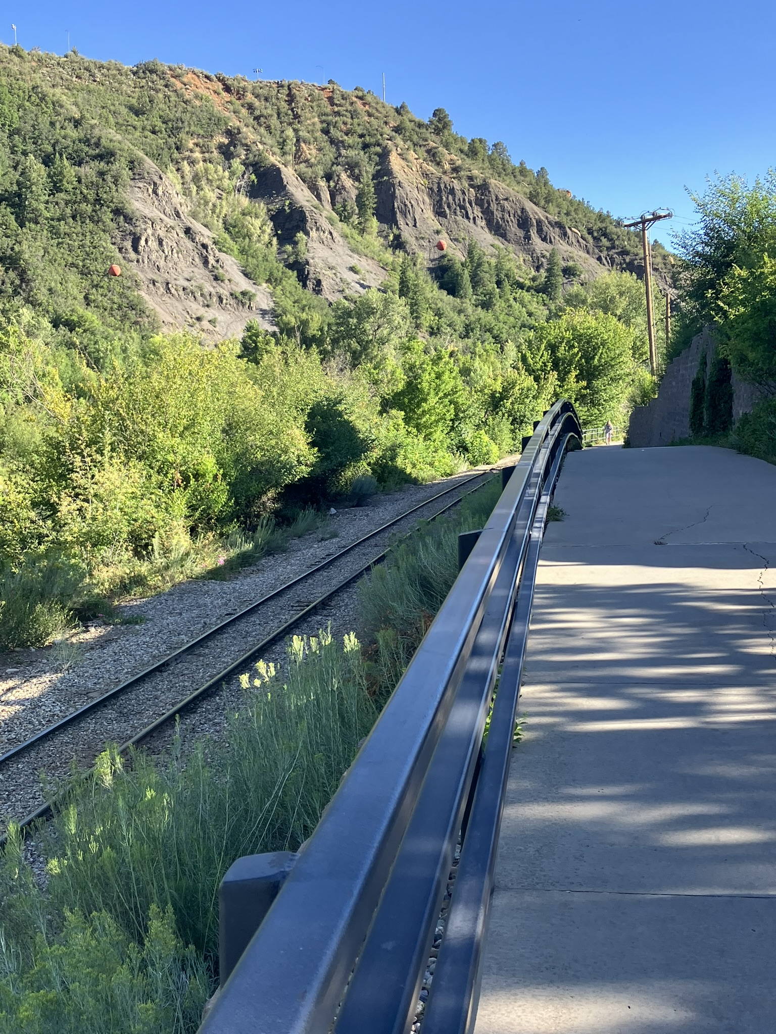 Before eating dinner in town on a beautiful evening, we walked the wonderful Durango river walking and biking trail that runs along the Animas River and the narrow gauge railroad, picking it up just behind our hotel. What a trail it is. Hard to imagine a more beautiful and serene trail (I’ve use those words a lot, but they’re so apt). It runs along the river, softball field, a lovely library and small botanical gardens, and neat stores and eateries, and has wonderful views all along, with walking bridges across the river, connecting to more walking trails, with easy access to the city streets.