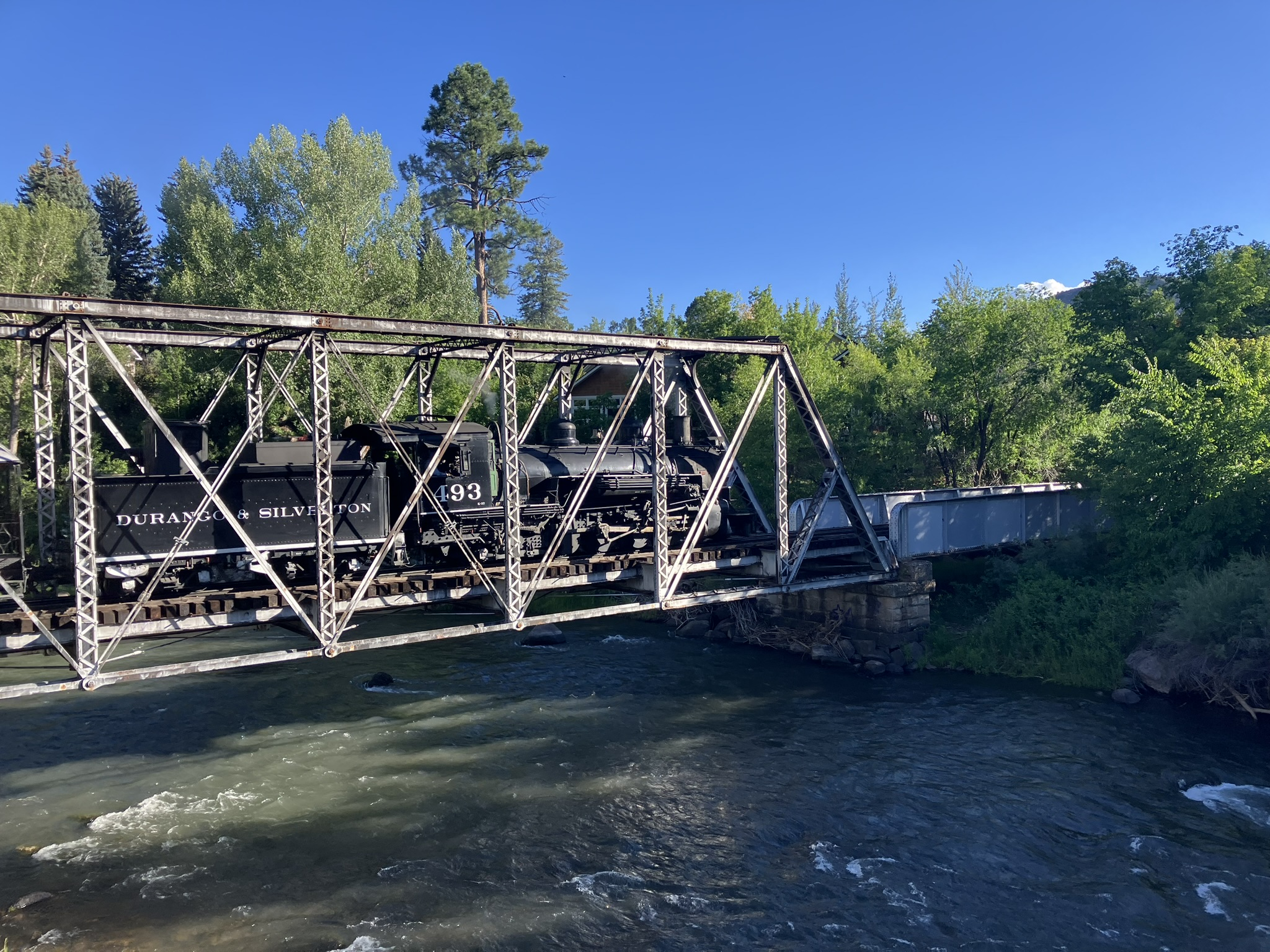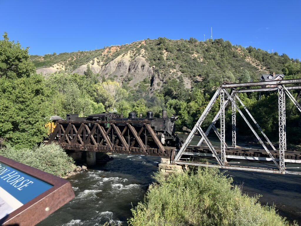Durango and Silverton Engine puffing into town over trestle alongside the river walk