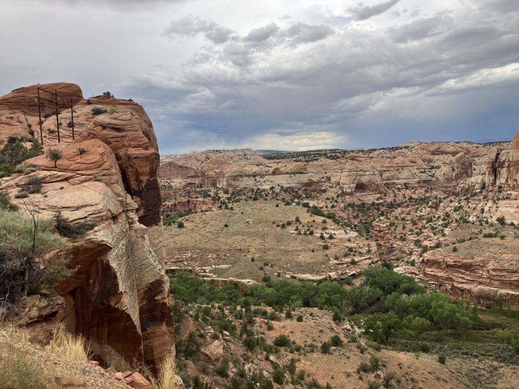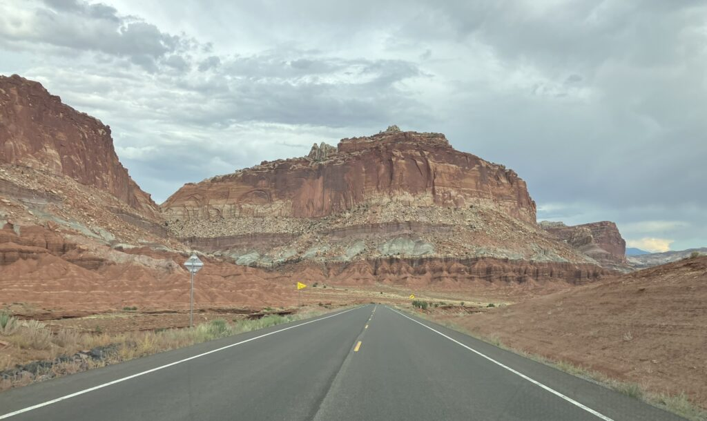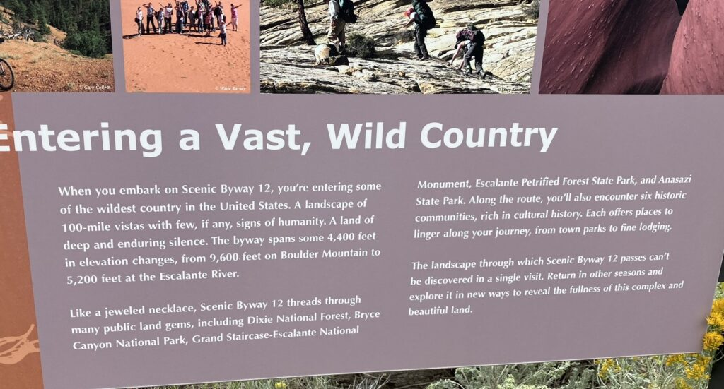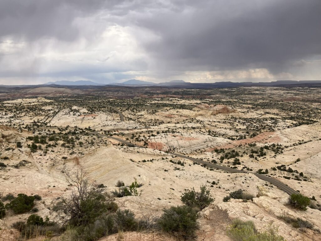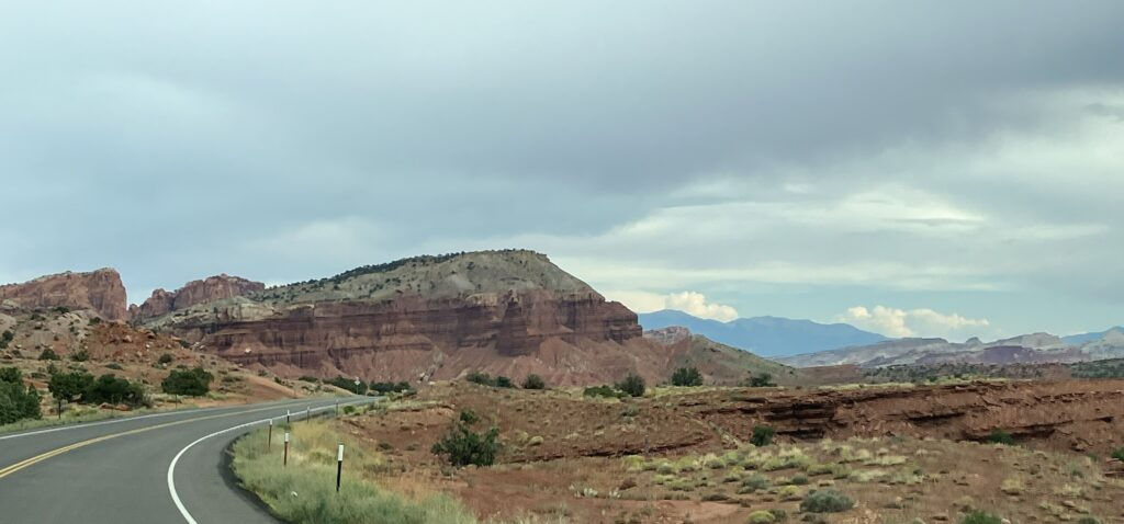 The driving was lovely at all times, and whether traveling fast, slow in the rain or when there was slower moving traffic ahead, or cautiously along the curving and twisting mountain roads, it felt leisurely, giving me plenty of time to think. I’m not sure whether I’ve traveled through the Grand Staircase before, which is vast (at 1.9 million acres, it’s slightly smaller than Delaware), but it is incredible (I’m going to wear out that word), with changing scenery, at times traveling alongside the desert and mountains, and at other times rising as high as almost 9,000 feet, looking down over vast dioramas of mountains and canyons stretching below and into the far distance.