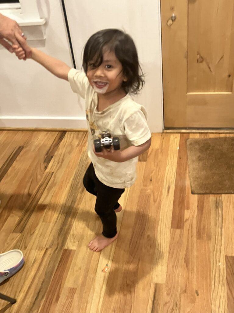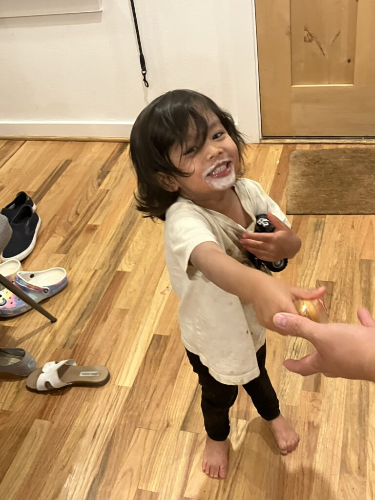 Through all this, once he got home from pre-school, Dev was delightful and unfazed, just plain having a good time. He sure loves that ice cream.