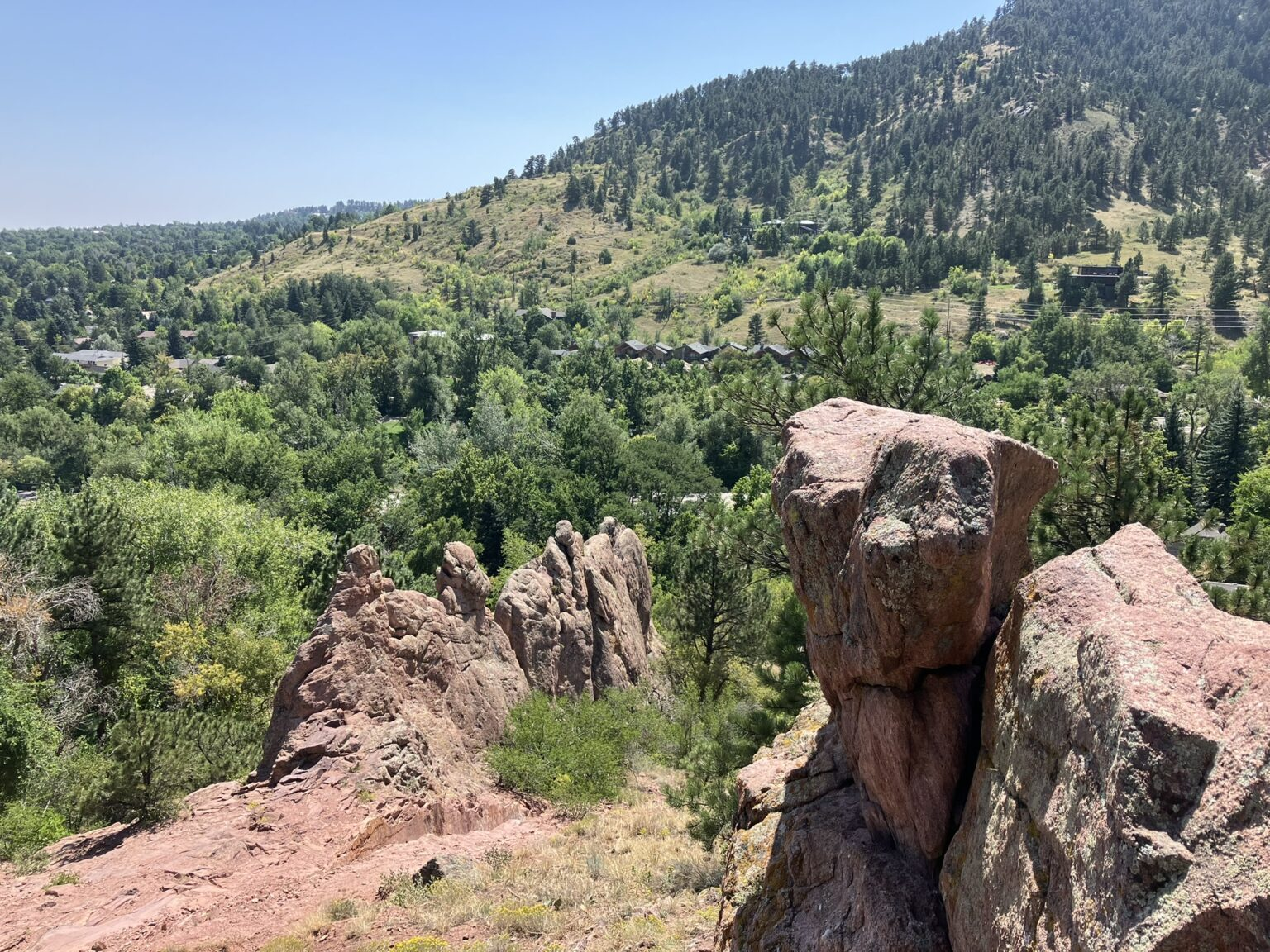 Where Pearl Street ends, west of downtown, is the People’s Crossing and its system of small trails, at the very start of Boulder Canyon. This is the city’s set of trails that people take, all fairly short trails, but some rugged, rising above the town. I walked the moderately difficult Red Rocks trail, about a mile round trip.