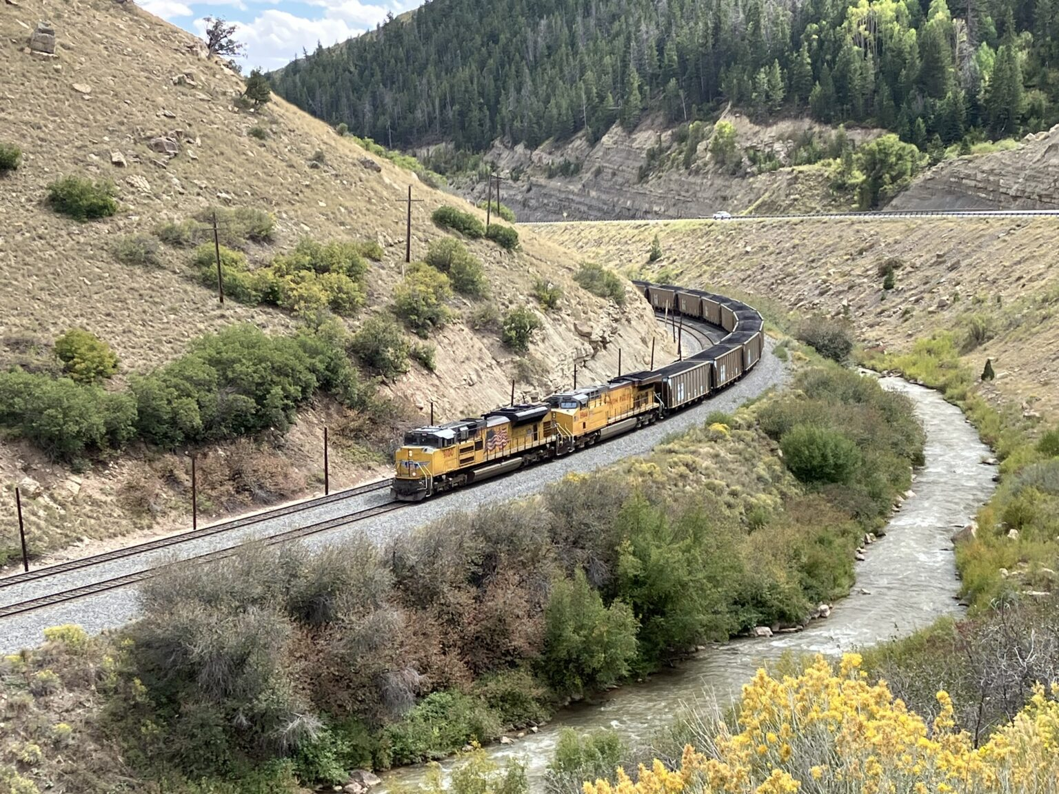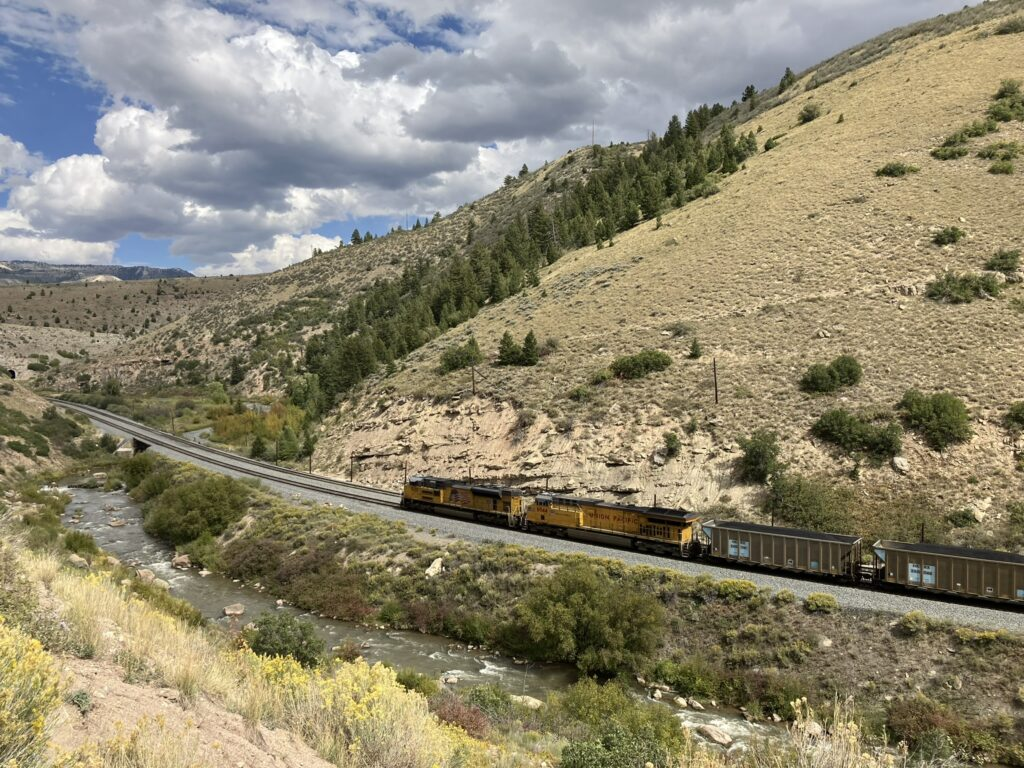 And then I saw it, a long, very long, very very long, set of coal cars trundling along the tracks to the side of and below the highway. It was so long, that it not had two diesel locomotives in the front pulling and two more in the rear pushing, but also had two diesels in the middle of the many, many freight cars carrying coal. No kidding, this train must have been close to or more than a mile long. In fact, freight trains out this way are often 2 miles or longer, and the longest in the U.S., is over 3½ miles long. Phew.