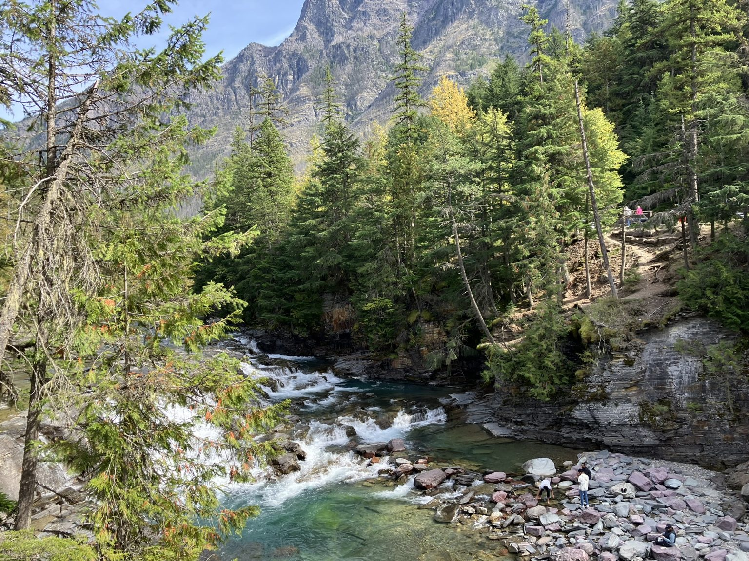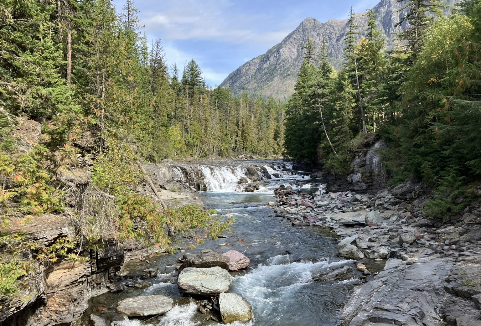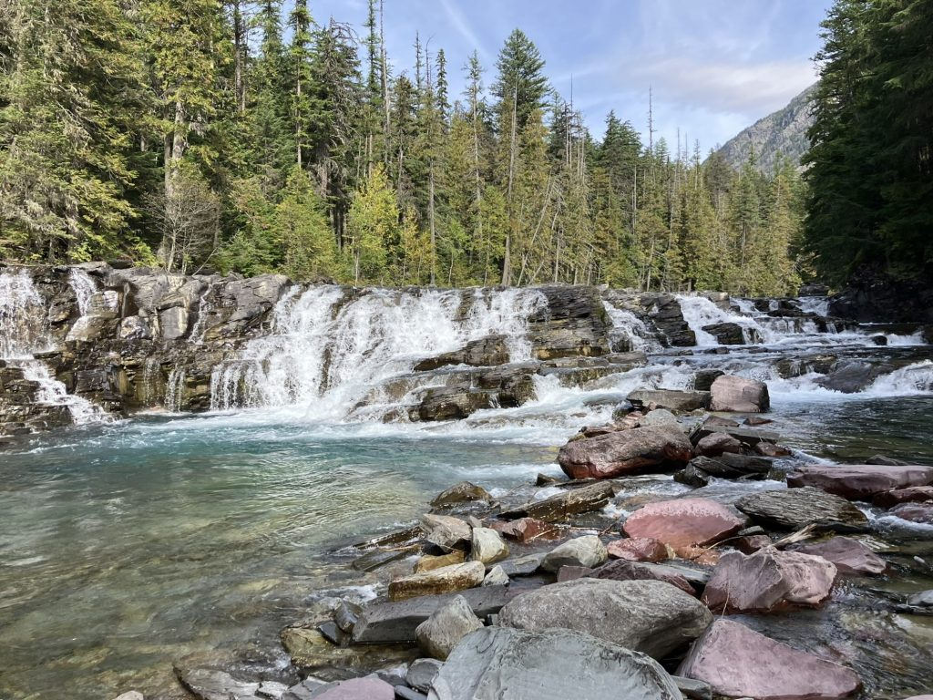 I came across Sacred Dancing Cascade, which aside from anything else iks a lovely name. It runs along McDonald Creek, which is a 25 mile river connecting McDonald Lake and St. Mary Lake. I took a short hike, crossing the river at one point, and got views from both sides.