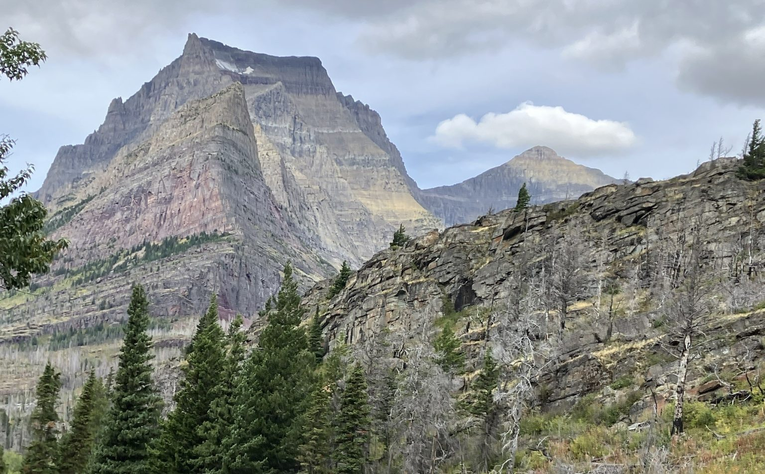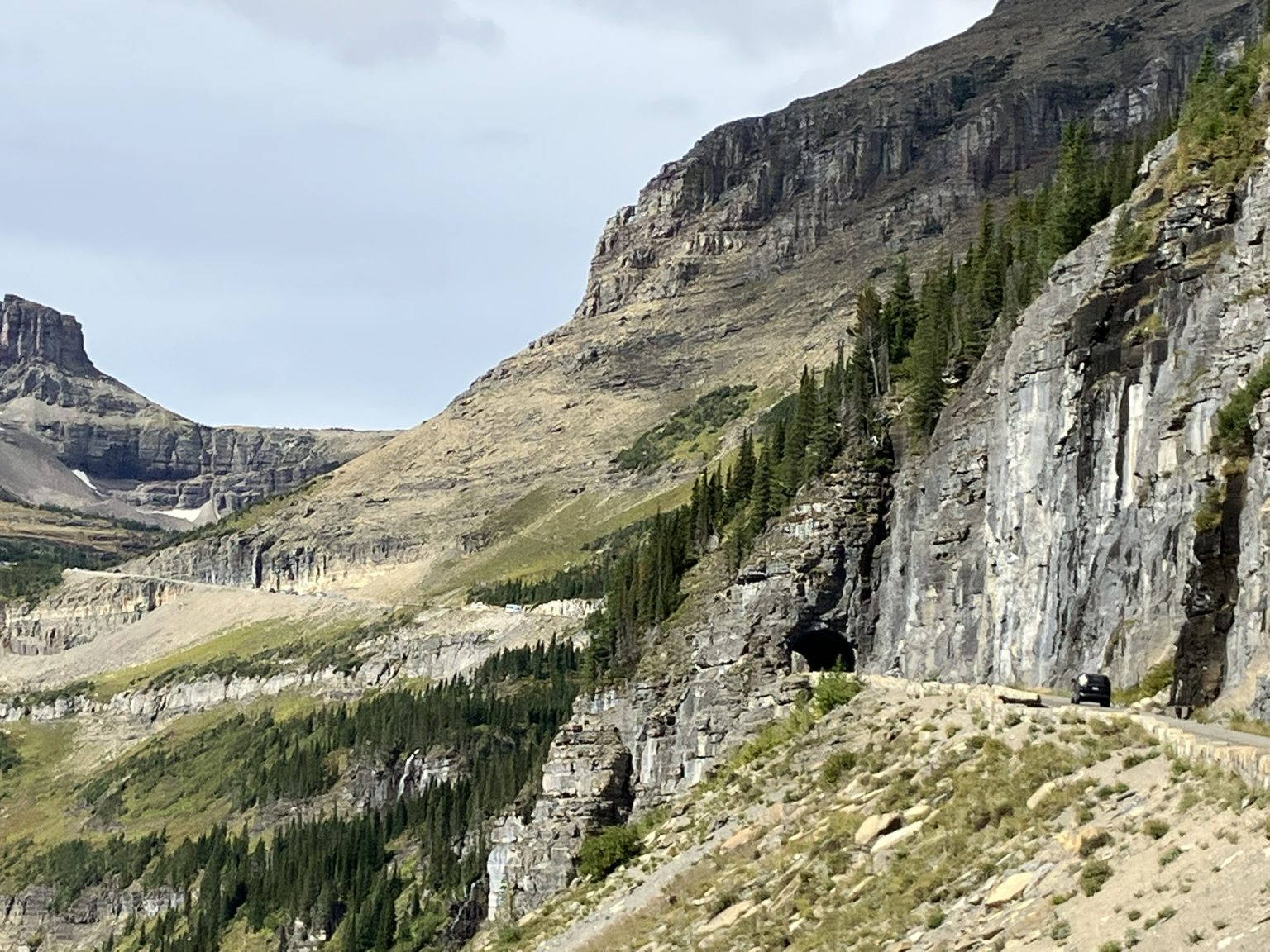 At Sunrift, a young guy, well equipped for photography and hiking, asked me if I could give him a ride to his jeep, parked near Logan Pass, about 4 miles away, and I agreed. So, instead of continuing to Baring Falls, we walked together back to the Sun Point parking area, where i gave him a lift. All in all, the little hike was probably about 1½ miles, less than I’d planned, but just as well, as I ran out of water before entering the park and hadn’t been able to find any water for sale in the park at the various visitor centers (they sell clothing and books, but no water). It wasn’t that the water was needed because of the heat, as it was still quite cool, but definitely for general thirst and hydration. For that reason, although I kept looking for somewhere to buy water in the park, I didn’t take any other hikes today, except for short walks, but I’ll be back tomorrow for at least a couple of hikes.