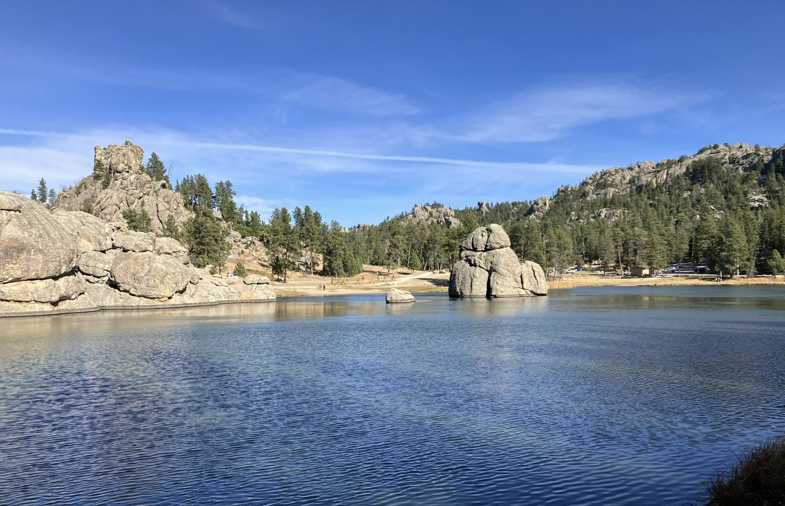 The scenic byway (and it is scenic) took me back to Custer State Park, where I headed to Sylvan Lake, about 17 acres, and one of five lakes in the park. Talk about serene, with beautiful rock formations all around the lake and in it. Here I finally took a good walk around the lake, around 3 miles, and clambered onto some of the rock formations. Serene, tranquil, lovely, and warm (even though only in the 50’s).