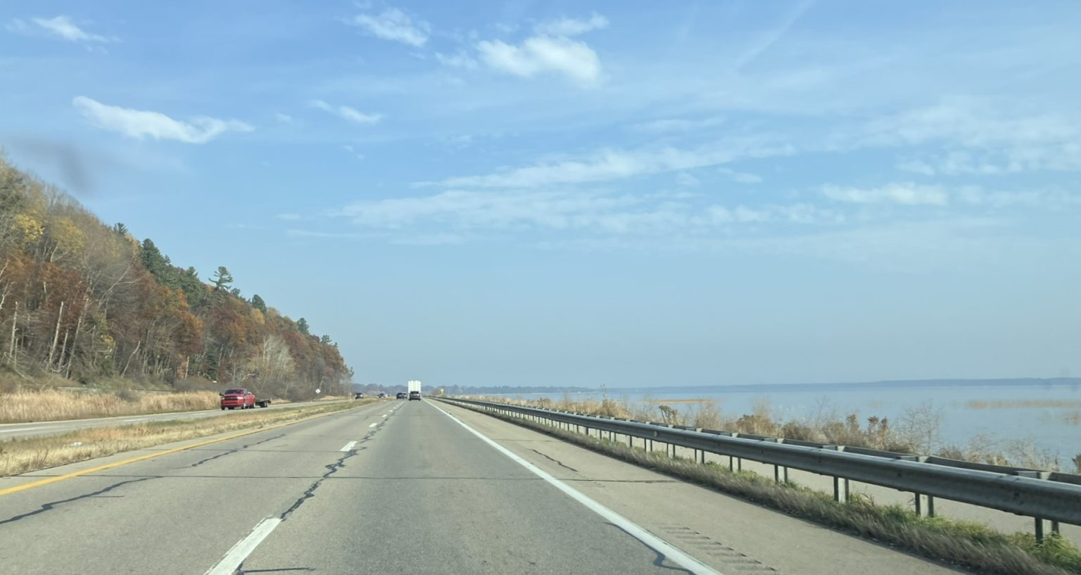 Today was a very a different day of driving. Not at first, but as I neared and then entered Michigan, taking state route 8 east, the highway became far more wooded , sometimes with thick green leaved evergreens, sometimes with bare trees, and sometimes with trees colored with autumn foliage, but far more forested, and in the summer the woods would be even thicker.
