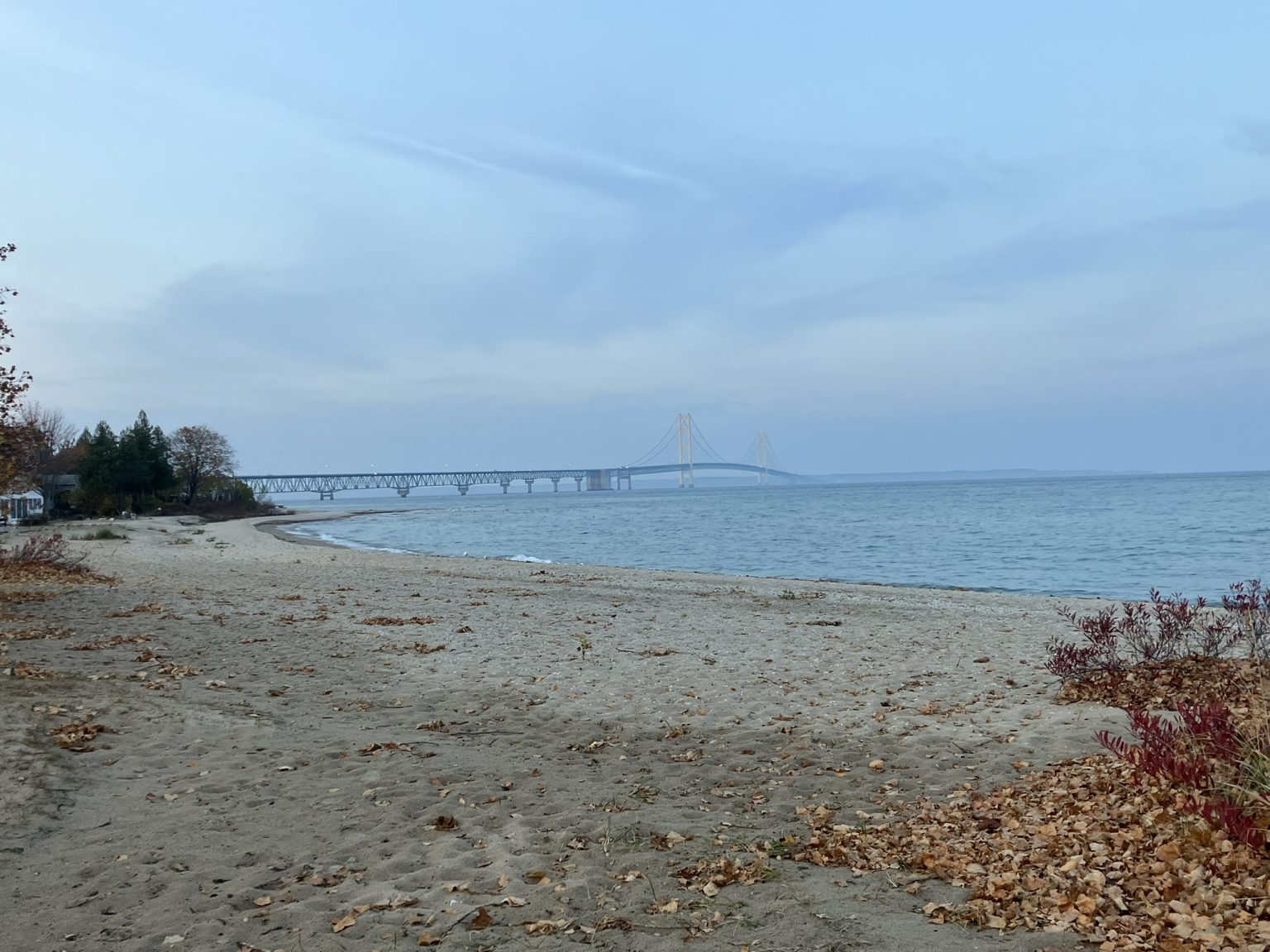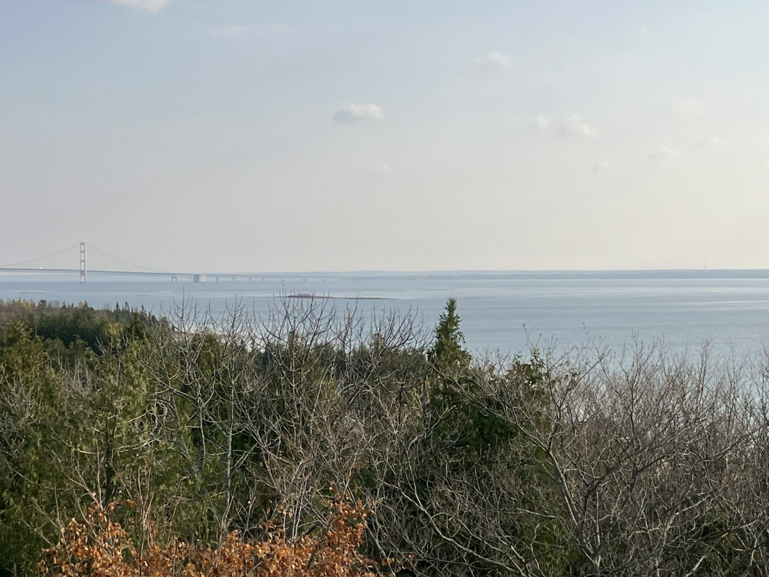 Now the drive was quite different. From flat grasslands and then along wooded state highways to now driving along a wide open coastline. What a change. Now I was traveling along the northern edge of Lake Michigan and the southern shore of the Upper Peninsular of Michigan, heading toward St. Ignace. Up ahead, I could see Mackinac Bridge, which not only spans the confluence of Lake Michigan to the west and Lake Huron to the east, but also connects the Upper Peninsular to the Lower Peninsular, and leads to Mackinaw City where I’ll be staying the next two nights.