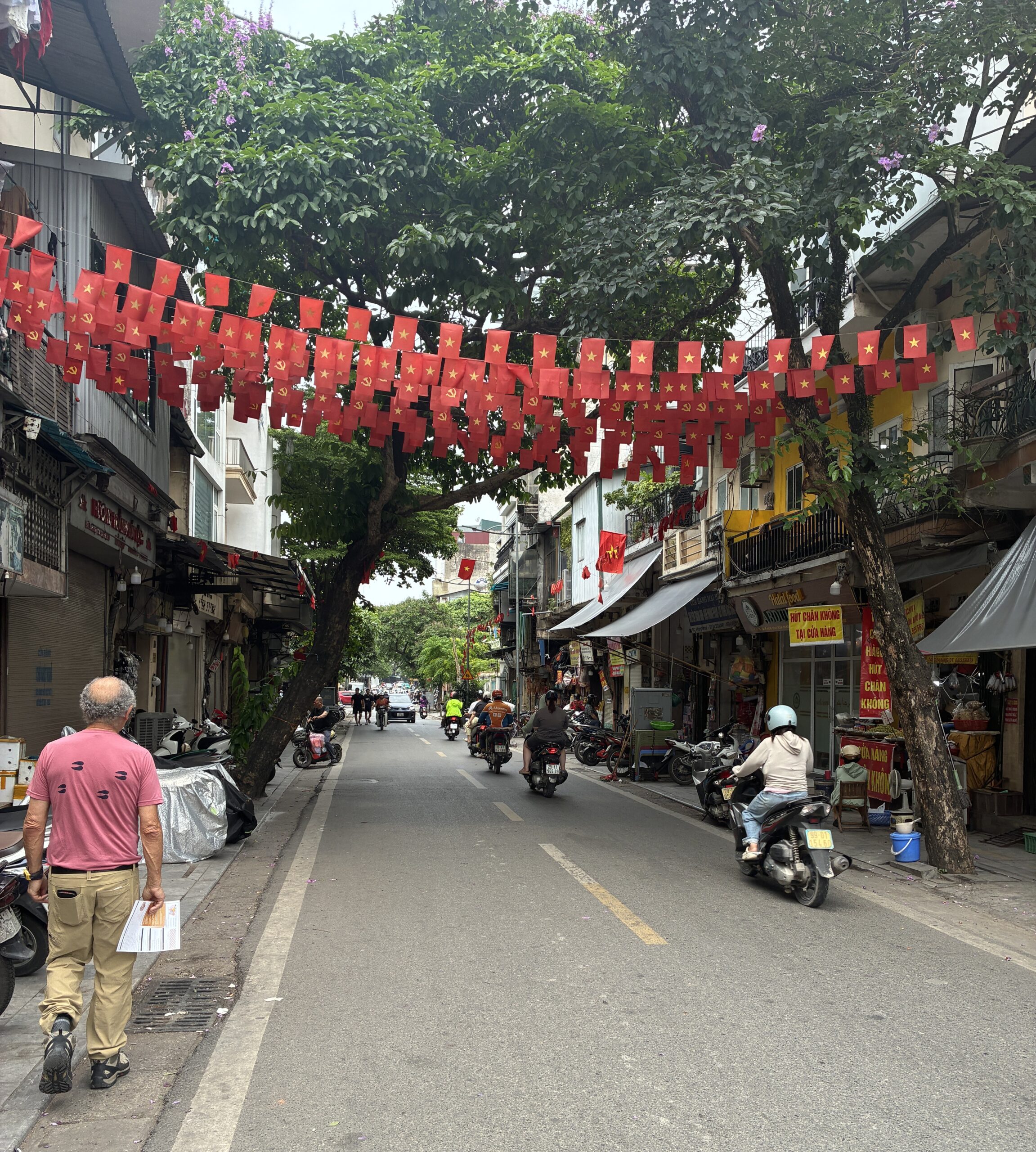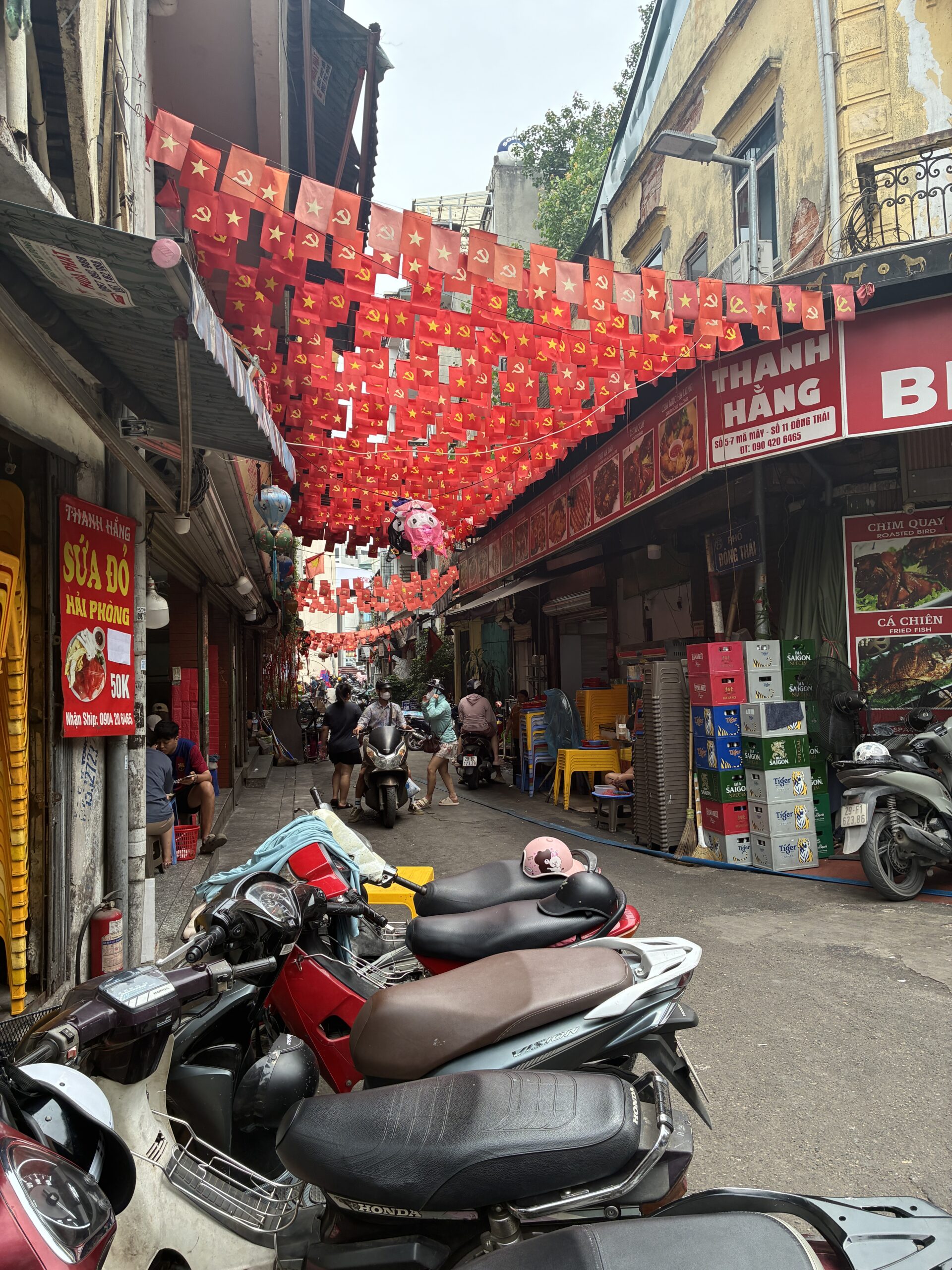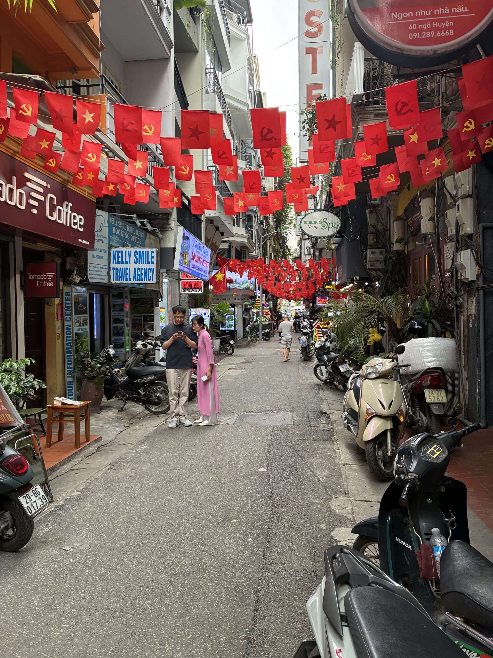 Small Korean flags, a yellow star on red background, and sometimes interspersed with flags showing the hammer and sickle, were everywhere, and a reminder that Vietnam is a communist country.