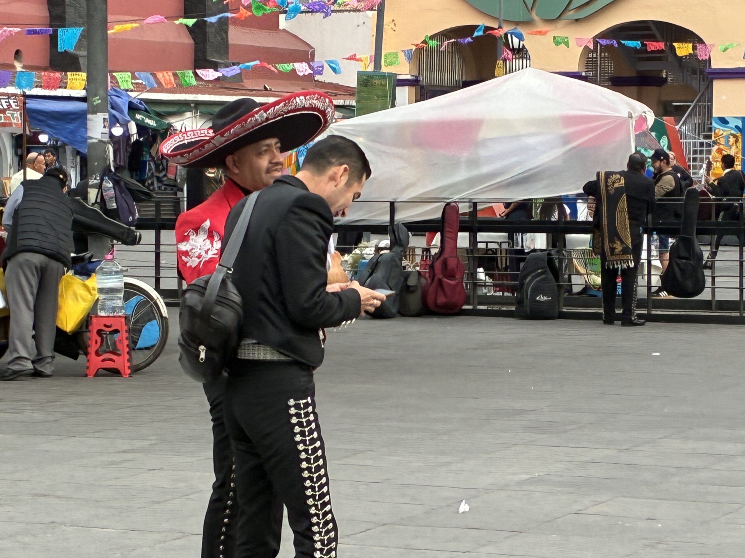 The map said about a 25 minute walk to the central plaza, the Mexico City Zócalo, and I headed that way but almost immediately spotted an interesting looking museum across the road and crossed the busy main road, where I found teems of Mariachi musicians just hanging out in front of the building (the museum itself is exactly what it says), and it turns out there are many more all over the large square, Plaza Garibaldi, behind the building. Apparently, this is where Mariachi wait to be hired for gigs, sort of like a union hall or hanging out in front of Home Depot waiting for daily work. It’s almost surreal.