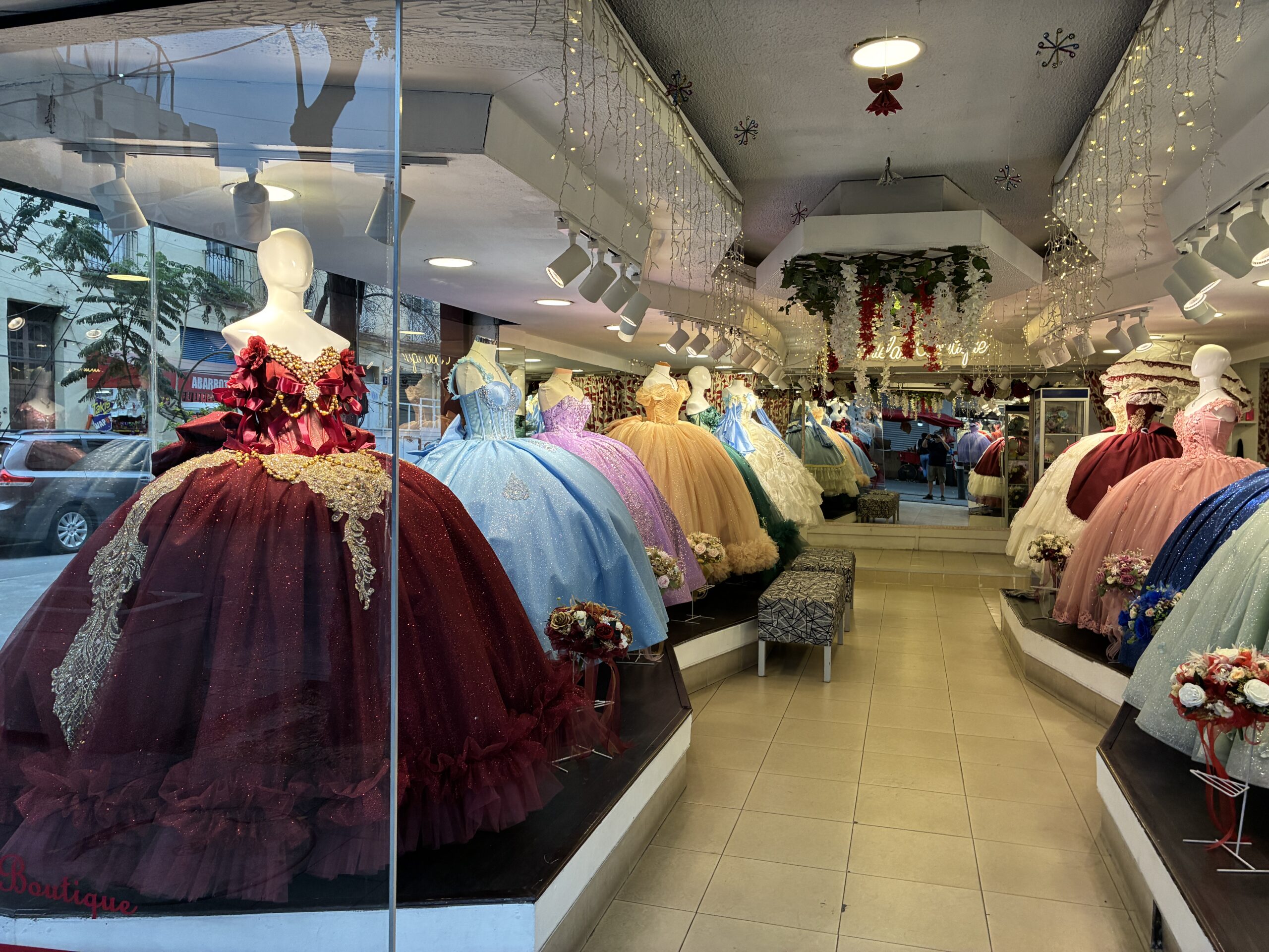Along one of the main streets, there was store after store and after store displaying ball gowns worn for Quinceañera celebrations, a traditional celebration marking a girl’s 15th birthday.