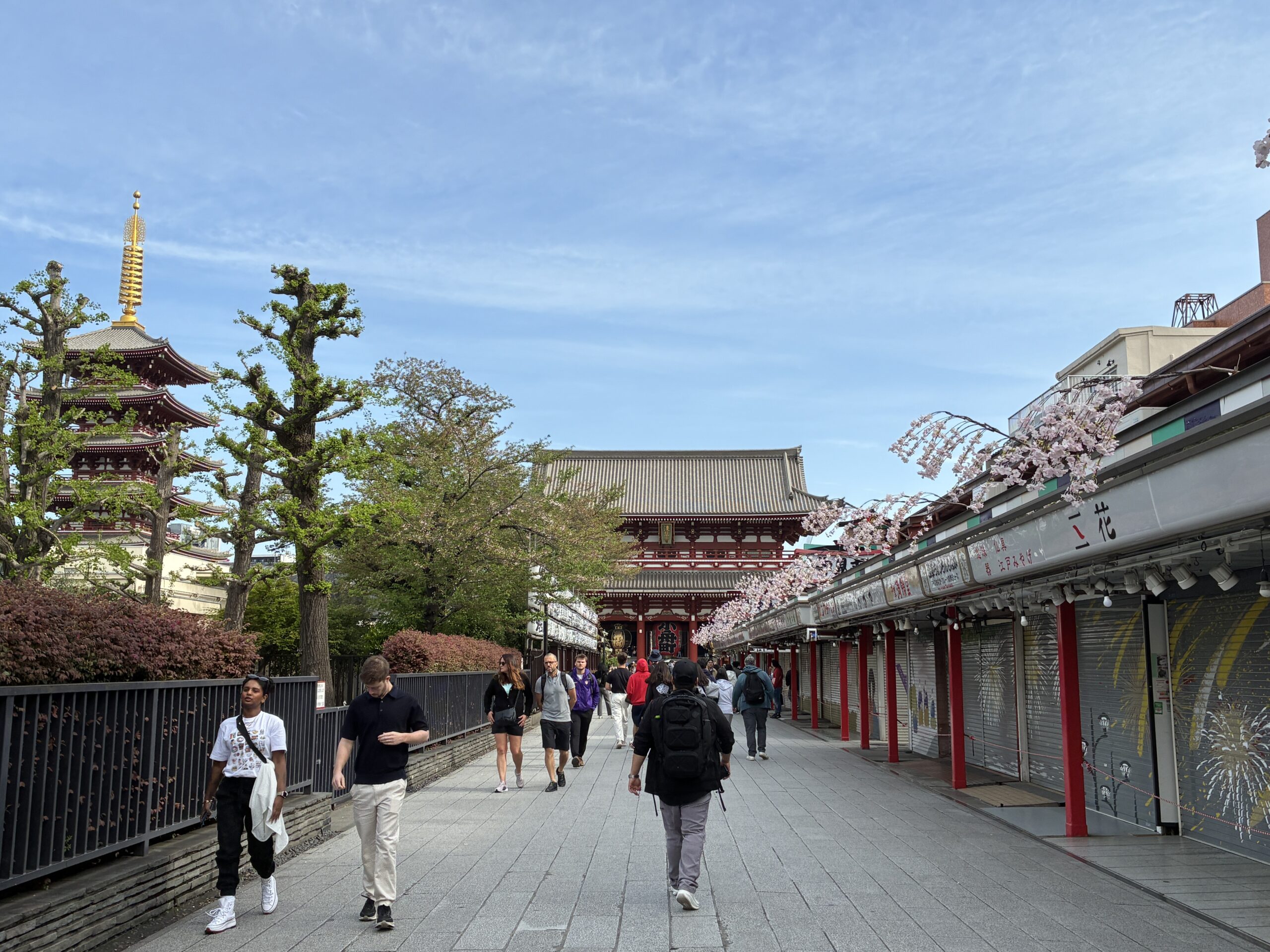Our guide was Loc, a young Vietnamese guy who spoke very good English, which he told me he’d learned from watching American movies and TV, and by taking classes in English while in University. Like every guide I’ve met on various walks, he was friendly and engaging, and did a nice job on a 2 hour walk, which mostly covered the areas we’d already (happily) walked, but now filled in with interesting history and facts. We passed again through the cherry blossomed area leading to the Sensō-ji temple, after first passing through the Kaminarimon gate, which means “Thunder Gate,” the main outer entrance to the temple complex, and well known for its huge red lantern, with statues of the gods of thunder and wind, Raijinand Fūjin, standing on either side. It also marks the start of Nakamise Street, a by now very bustling and crowded street leading up to the temple, lined on both sides with small stores and overhanging cherry blossom.