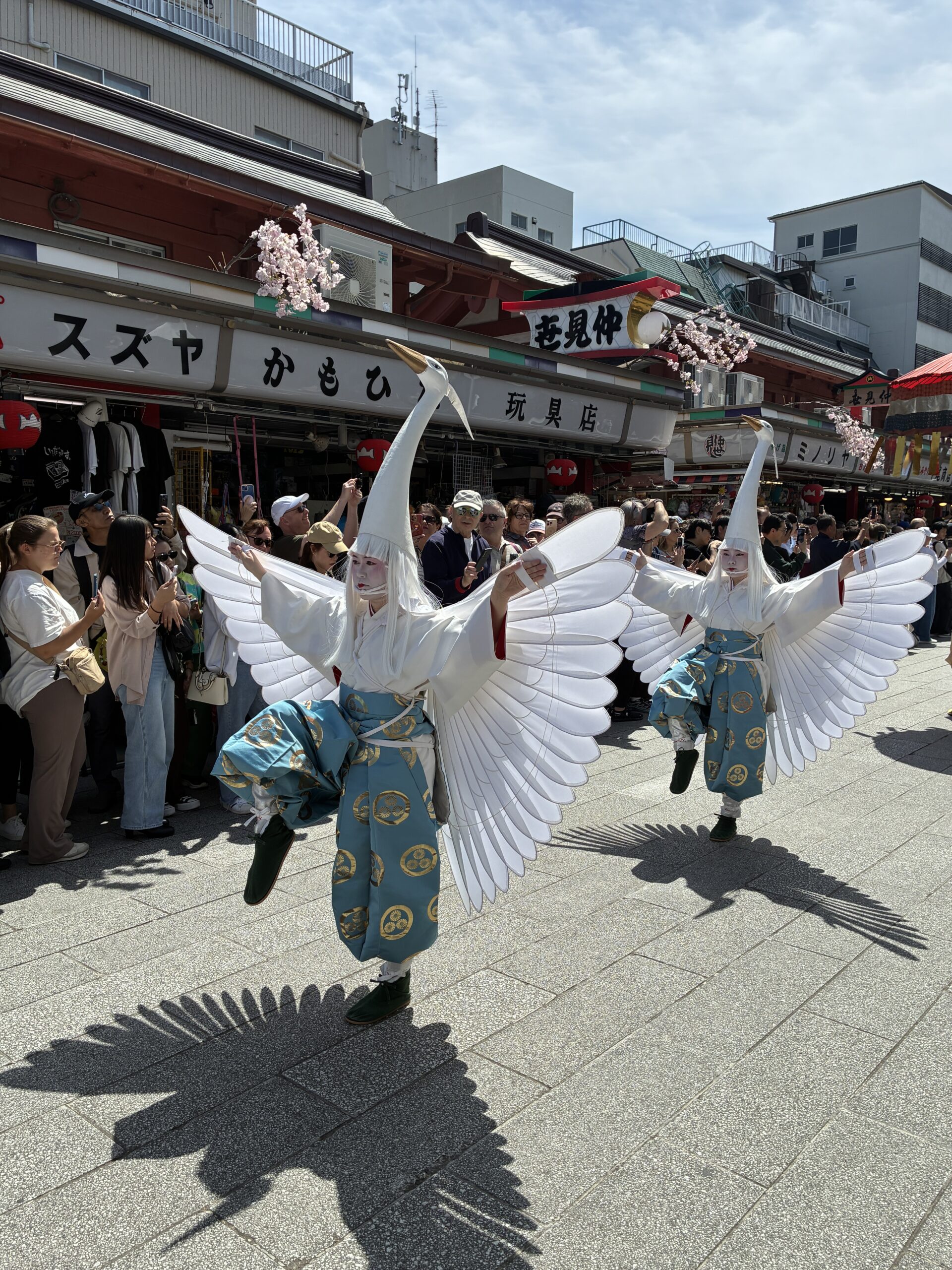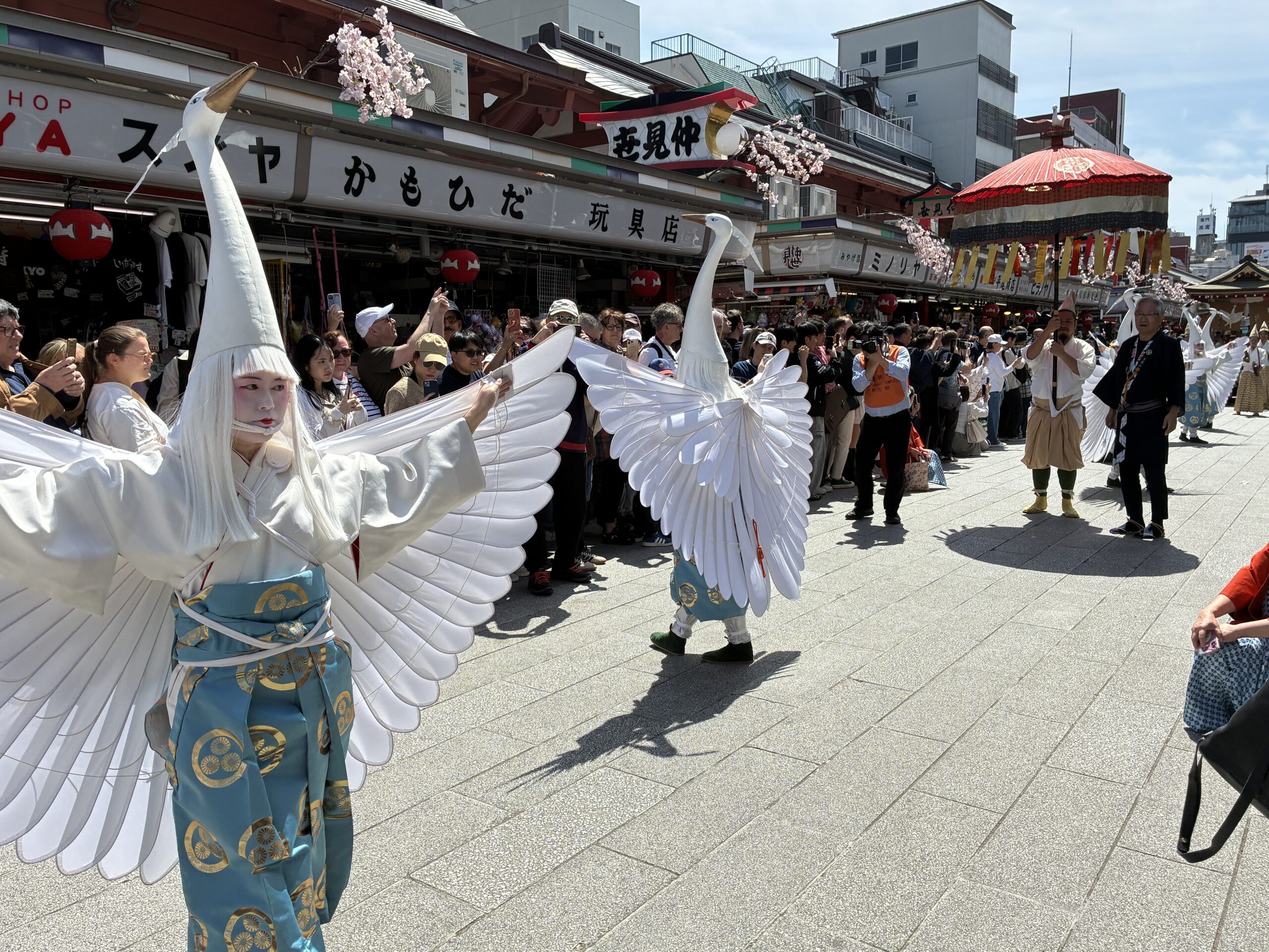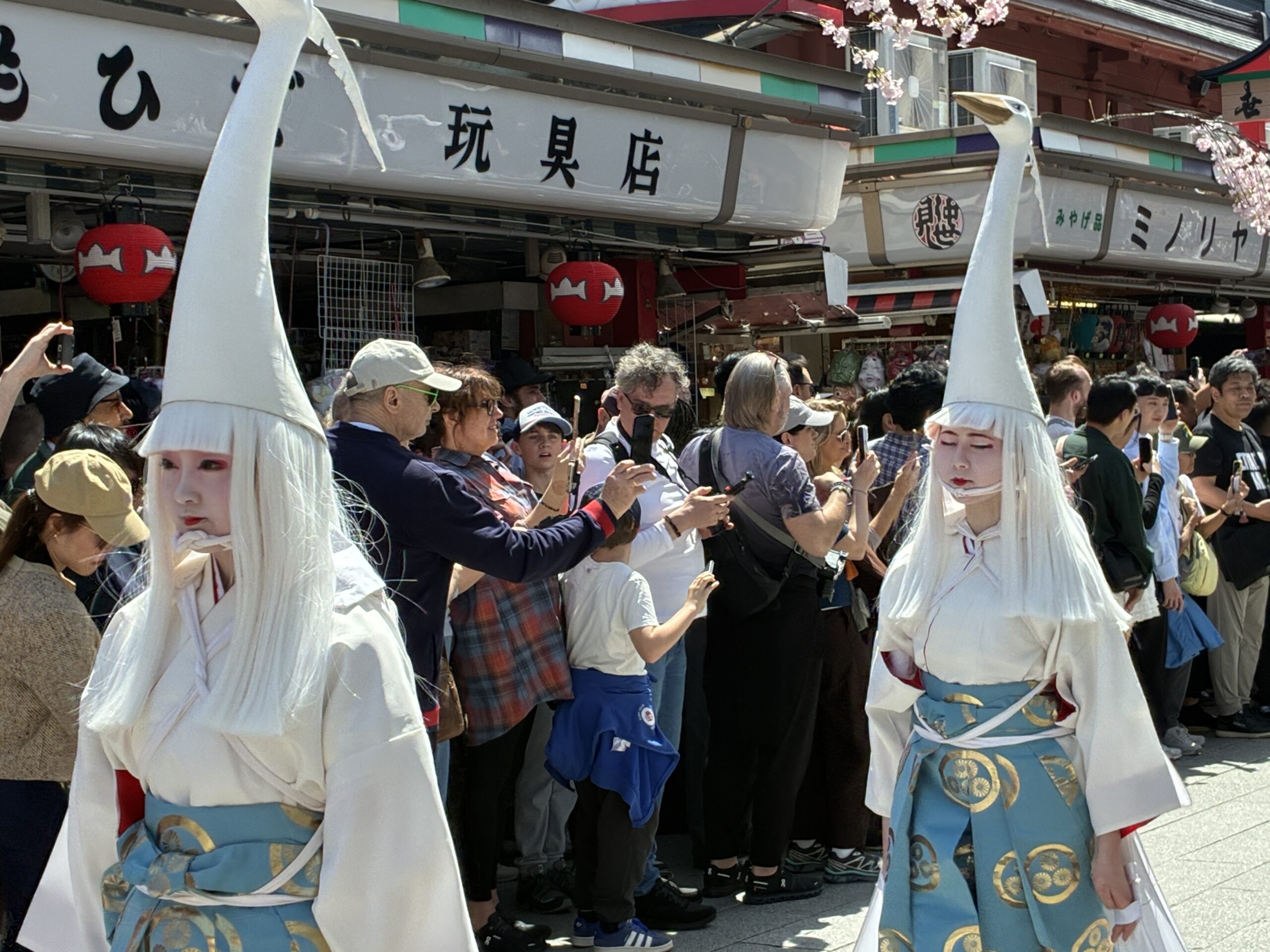 We were very lucky, not only to be staying in such an iconic district and to have earlier walked these now bustling streets when they were empty, but also because this is one of the few days each year when the White Heron dance (Shirasagi-no-Mai) is performed and the White Heron procession moves along Nakamise Street, moving slowly toward the temple. Police and officials pushed back the crowds to form an avenue along Nakamise Street for the procession to pass, and we had front row seats (so to speak). The dance is a recreation of a 17th-century temple ceremony, and the style and costumes are based on Heian-period Japan, over 1,000 years ago. It was lovely.